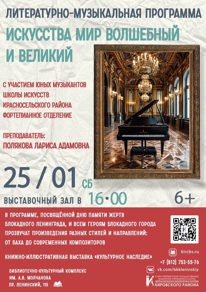 25 января в 16.00 в Выставочном зале Библиотечно-культурного комплекса им. А. В. Молчанова (Ленинский пр., д. 115) состоится Литературно-музыкальная программа "Искусства мир волшебный и великий".
