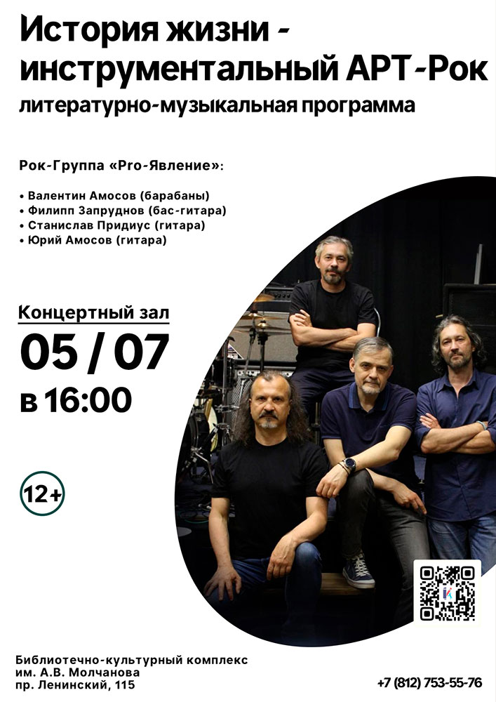 5 июля в 16.00 в Концертном зале Библиотечно-культурного комплекса им. А. В. Молчанова (Ленинский пр., д. 115) состоится Литературно-музыкальная программа "История жизни - инструментальный АРТ-Рок".