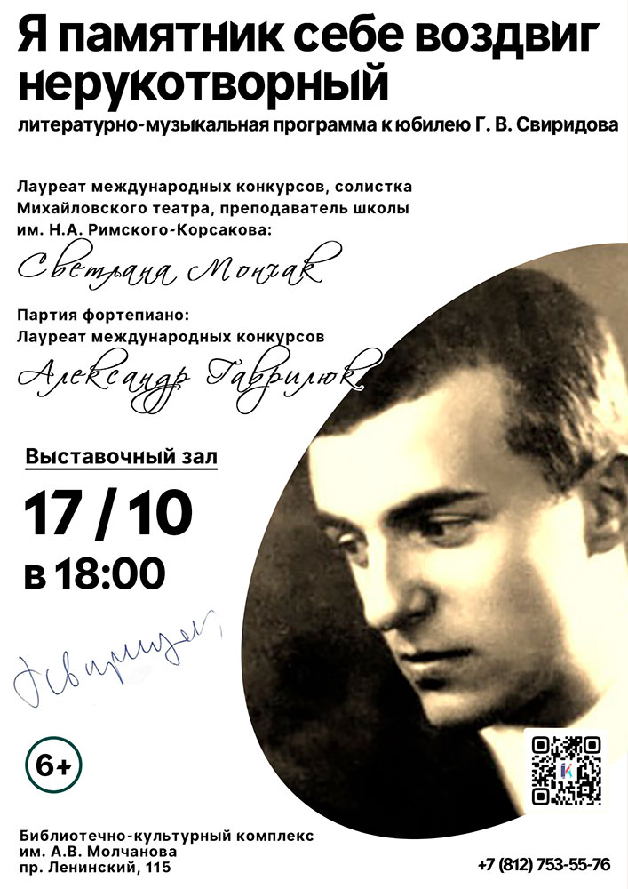 17 октября в 18.00 в Выставочном зале Библиотечно-культурного комплекса им. А. В. Молчанова (Ленинский пр., д. 115) состоится Литературно-музыкальная программа к юбилею Г. В. Свиридова "Я памятник себе воздвиг нерукотворный".