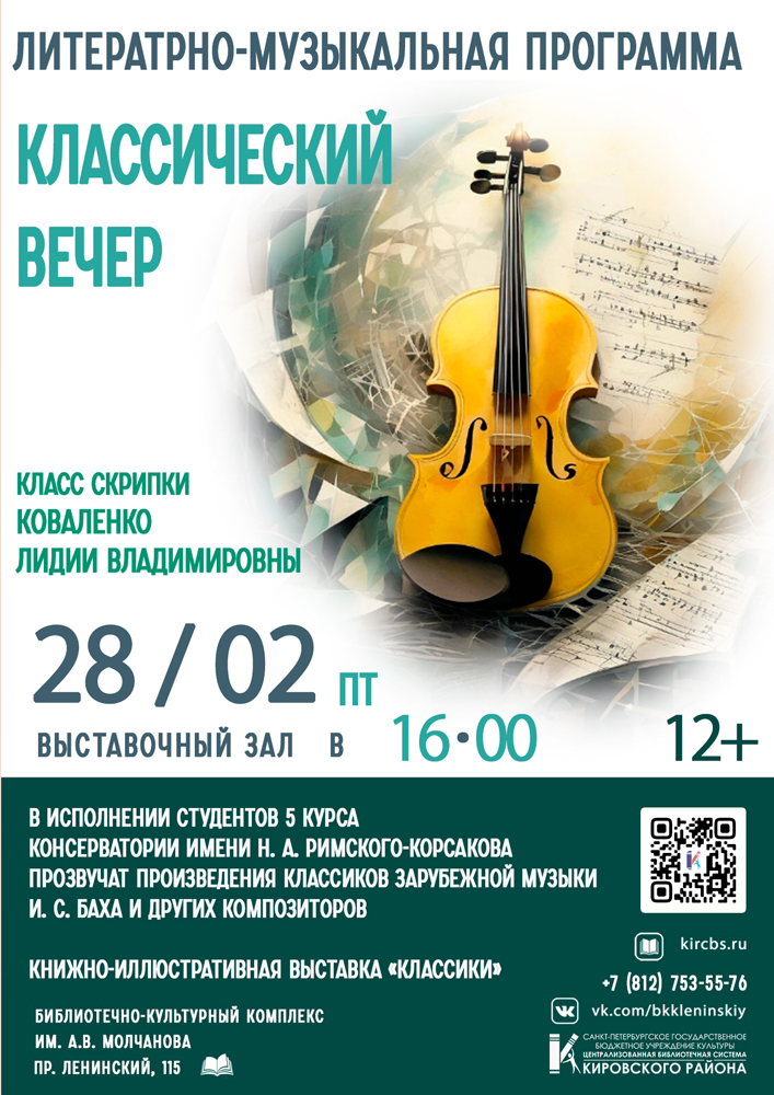 28 февраля в 16.00 в Выставочном зале Библиотечно-культурного комплекса им. А. В. Молчанова (Ленинский пр., д. 115) состоится Литературно-музыкальная программа "Классический вечер".