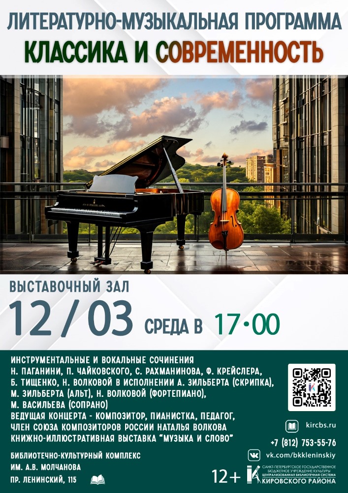 12 марта в 17.00 в Выставочной гостиной Библиотеки №4/ Библиотечно-культурного комплекса им. А.В. Молчанова (Ленинский пр., д. 115) состоится литературно-музыкальная программа "Классика и современность".