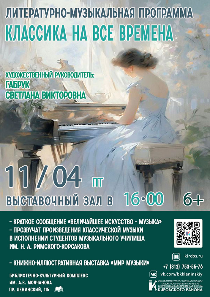 11 апреля в 16.00 в Выставочном зале Библиотечно-культурного комплекса им. А. В. Молчанова (Ленинский пр., д. 115) состоится Литературно-музыкальная программа "Классика на все времена".