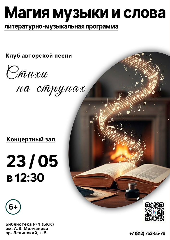 23 мая в 12.30 в концертном зале Библиотеки №4 (Библиотечно-культурного комплекса) им. А. В. Молчанова (Ленинский пр., д. 115) состоится Литературно-музыкальная программа "Магия музыки и слова".