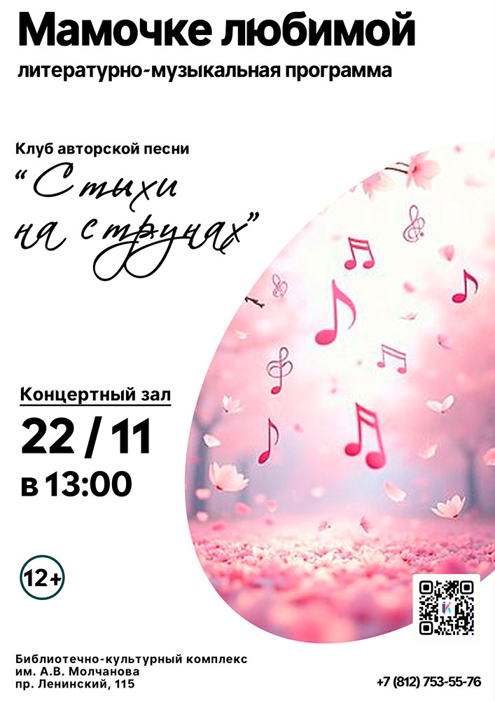 22 ноября в 13.00 в Концертном зале Библиотечно-культурного комплекса им. А. В. Молчанова (Ленинский пр., д. 115) состоится Литературно-музыкальная программа "Мамочке любимой".
