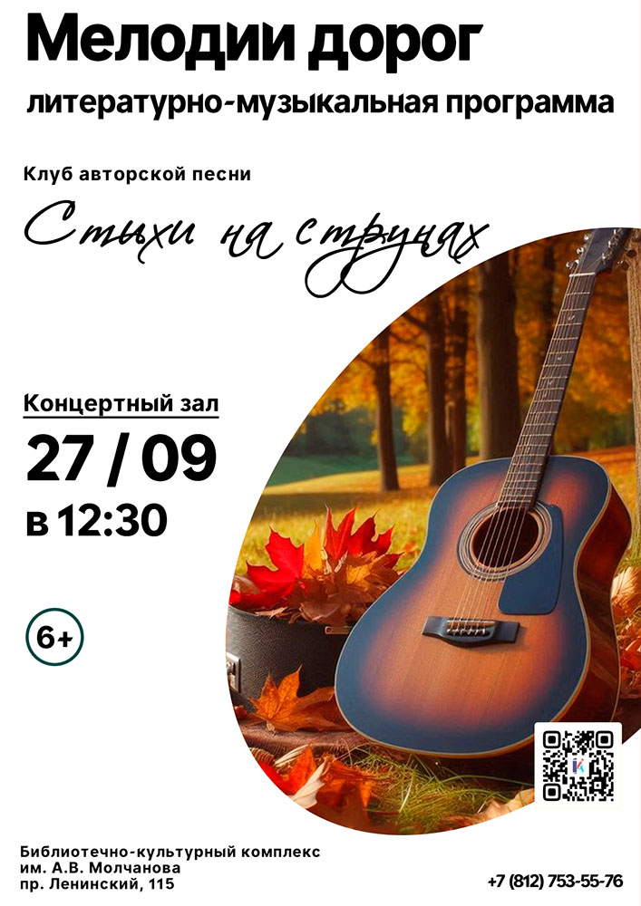 27 сентября в 12.30 в Концертном зале Библиотечно-культурного комплекса им. А. В. Молчанова (Ленинский пр., д. 115) состоится Литературно-музыкальная программа "Мелодии дорог".