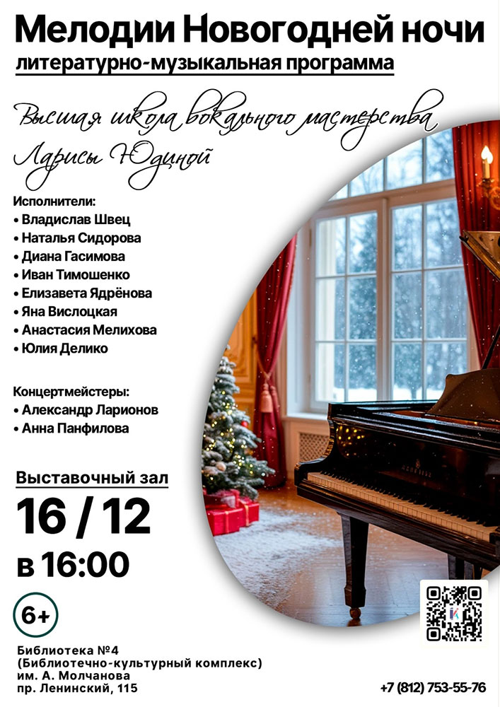 16 декабря в 16.00 в Выставочном зале Библиотеки №4 (Библиотечно-культурного комплекса) им. А. Молчанова (Ленинский пр., д. 115) состоится Литературно-музыкальная программа "Мелодии Новогодней ночи".