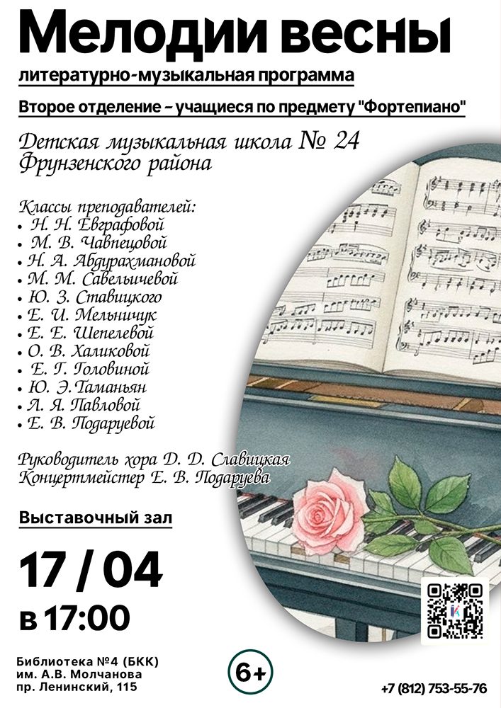 17 апреля в 17.00 в Выставочном зале Библиотеки №4 (Библиотечно-культурного комплекса) им. А. В. Молчанова (Ленинский пр., д. 115) состоится Литературно-музыкальная программа "Мелодии весны".