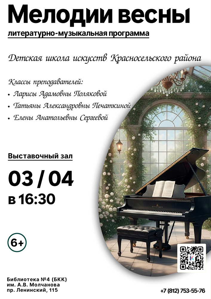 3 апреля в 16.30 в выставочном зале Библиотеки №4 (Библиотечно-культурного комплекса) им. А. В. Молчанова (Ленинский пр., д. 115) состоится Литературно-музыкальная программа "Мелодии весны".