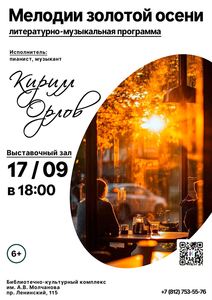 17 сентября в 18.00 в Выставочном зале Библиотечно-культурного комплекса им. А. В. Молчанова (Ленинский пр., д. 115) состоится Литературно-музыкальная программа "Мелодии золотой осени".