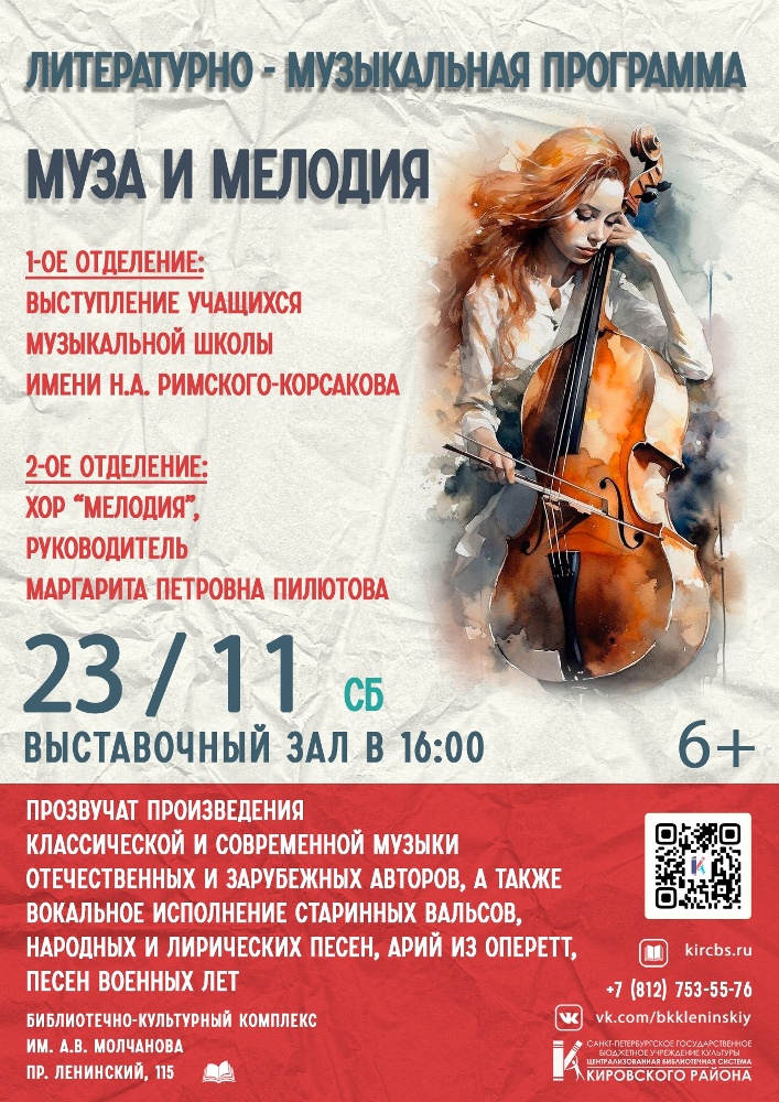23 ноября в 16.00 в Выставочном зале Библиотечно-культурного комплекса им. А. В. Молчанова (Ленинский пр., д. 115) состоится Литературно-музыкальная программа "Муза и мелодия".