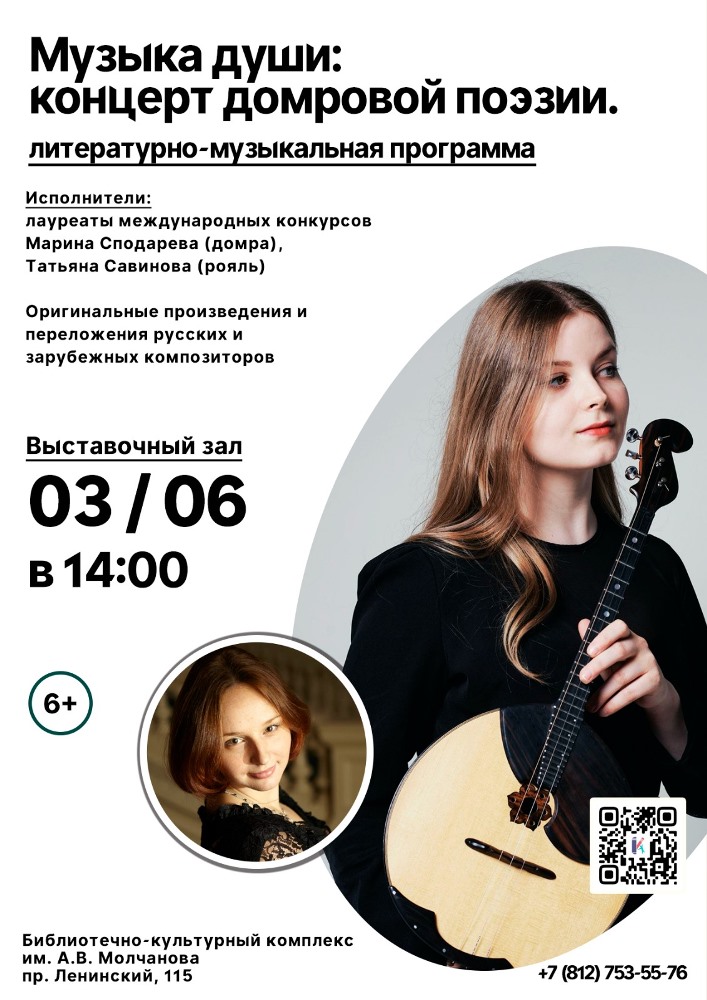 3 июня в 14.00 в Выставочном зале Библиотечно-культурного комплекса им. А. В. Молчанова (Ленинский пр., д. 115) состоится Литературно-музыкальная программа "Музыка души: концерт домровой поэзии".