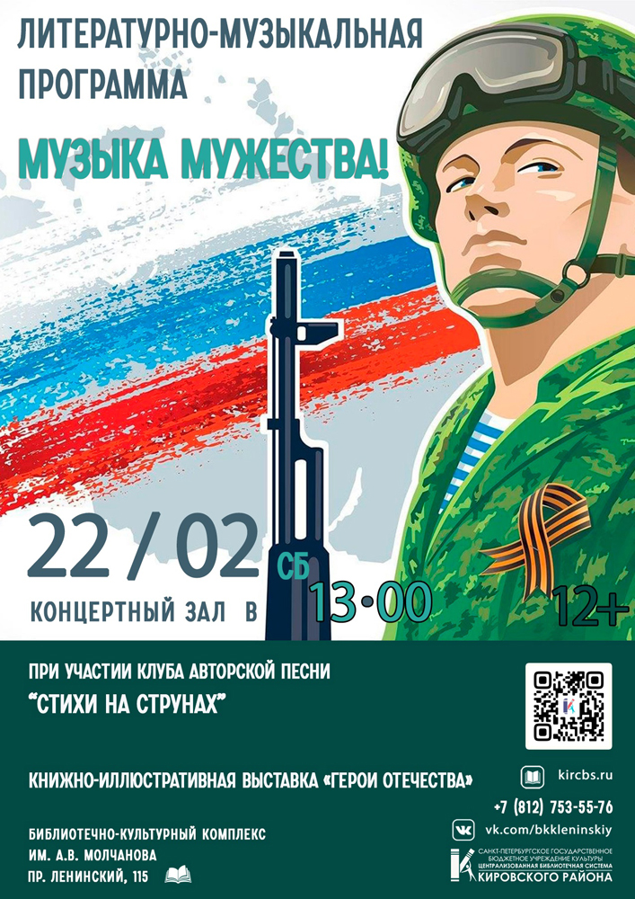 22 февраля в 13.00 в Концертном зале Библиотечно-культурного комплекса им. А. В. Молчанова (Ленинский пр., д. 115) состоится Литературно-музыкальная программа "Музыка мужества".
