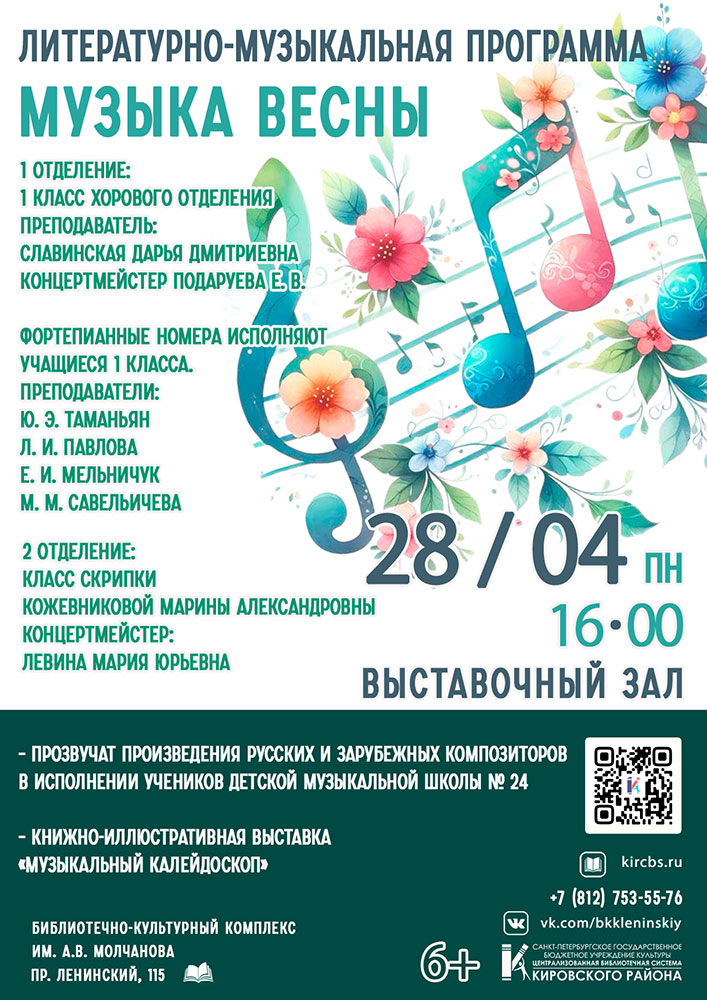 28 апреля в 16.00 в Выставочном зале Библиотечно-культурного комплекса им. А. В. Молчанова (Ленинский пр., д. 115) состоится Литературно-музыкальная программа "Музыка весны".