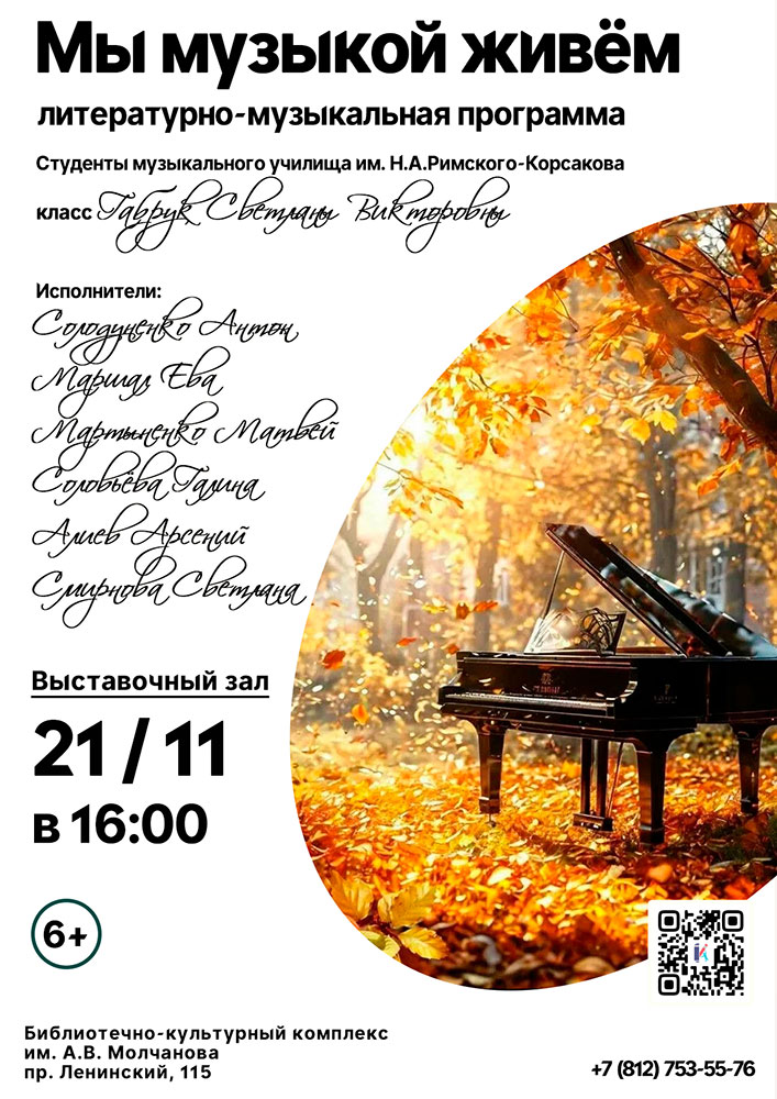 21 ноября в 16.00 в Выставочном зале Библиотечно-культурного комплекса им. А. В. Молчанова (Ленинский пр., д. 115) состоится Литературно-музыкальная программа "Мы музыкой живём".