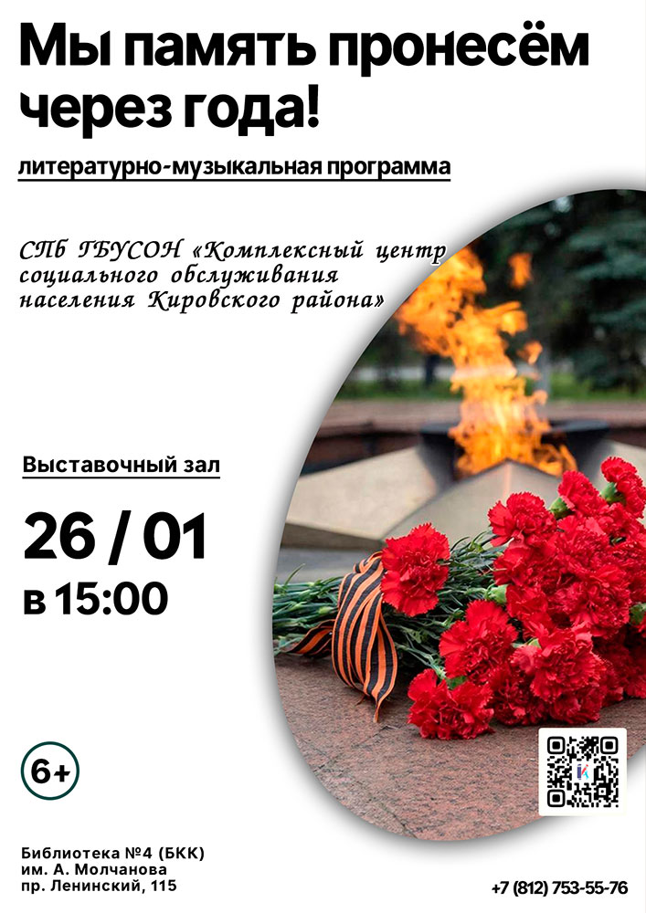 26 января в 15.00 в выставочном зале Библиотеки №4 (Библиотечно-культурного комплекса) им. А. Молчанова (Ленинский пр., д. 115) состоится Литературно-музыкальная программа "Мы память пронесём через года!".