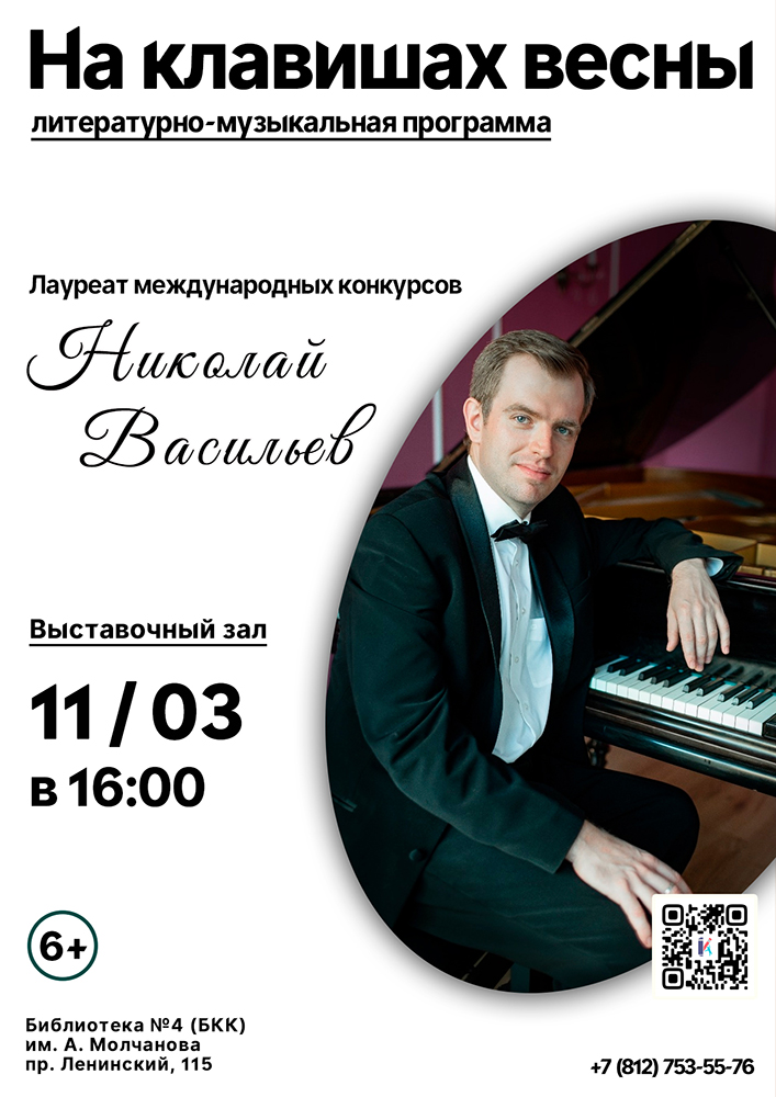 11 марта в 16.00 в Выставочном зале Библиотеки №4 (Библиотечно-культурного комплекса) им. А. В. Молчанова (Ленинский пр., д. 115) состоится Литературно-музыкальная программа "На клавишах весны".
