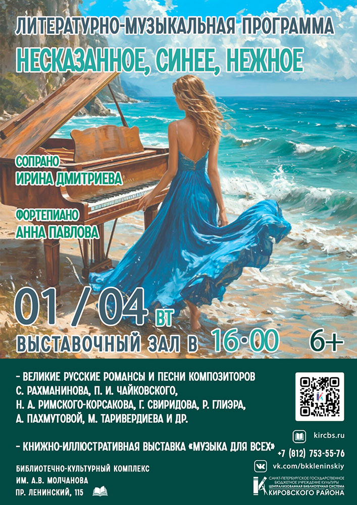 1 апреля в 16.00 в Выставочном зале Библиотечно-культурного комплекса им. А. В. Молчанова (Ленинский пр., д. 115) состоится Литературно-музыкальная программа "Несказанное, синее, нежное".