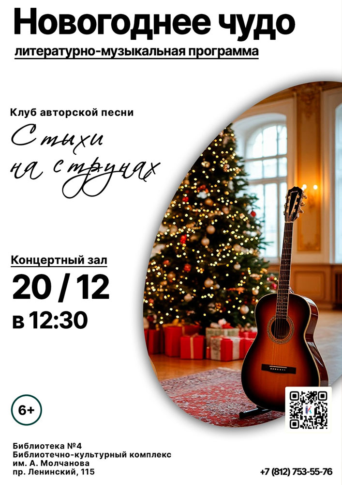 20 декабря в 12.30 в Концертном зале Библиотеки №4 (Библиотечно-культурного комплекса) им. А. Молчанова (Ленинский пр., д. 115) состоится Литературно-музыкальная программа "Новогоднее чудо".