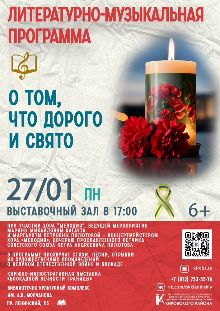 27 января в 17.00 в Выставочном зале Библиотечно-культурного комплекса им. А. В. Молчанова (Ленинский пр., д. 115) состоится Литературно-музыкальная программа "О том, что дорого и свято".