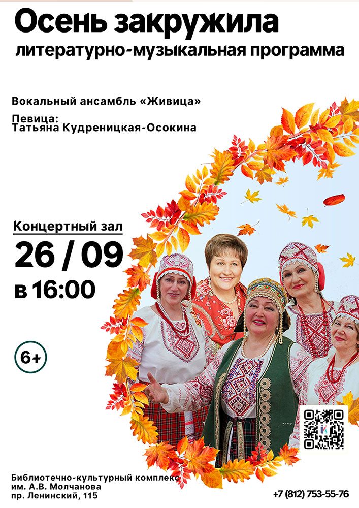 26 сентября в 16.00 в Библиотечно-культурном комплексе им. А. В. Молчанова (Ленинский пр., д. 115) состоится Литературно-музыкальная программа "Осень закружила".