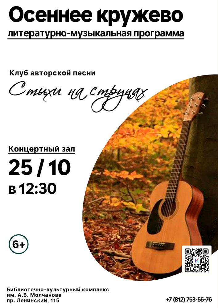 25 октября в 12.30 в Концертном зале Библиотечно-культурного комплекса им. А. В. Молчанова (Ленинский пр., д. 115) состоится Литературно-музыкальная программа "Осеннее кружево".