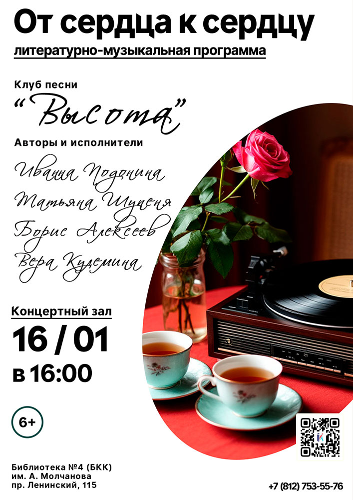 16 января в 16.00 в Концертном зале Библиотеки №4 (Библиотечно-культурного комплекса) им. А. Молчанова (Ленинский пр., д. 115) состоится Литературно-музыкальная программа "От сердца к сердцу".