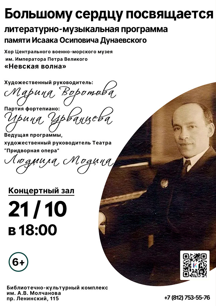 21 октября в 18.00 в Концертном зале Библиотечно-культурного комплекса им. А. В. Молчанова (Ленинский пр., д. 115) состоится Литературно-музыкальная программа памяти Исаака Осиповича Дунаевского "Большому сердцу посвящается".