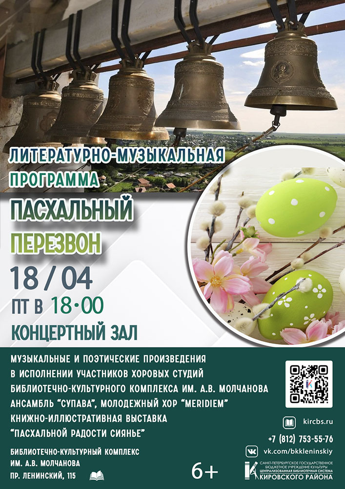 18 апреля в 18.00 в Концертном зале Библиотечно-культурного комплекса им. А. В. Молчанова (Ленинский пр., д. 115) состоится Литературно-музыкальная программа "Пасхальный перезвон".