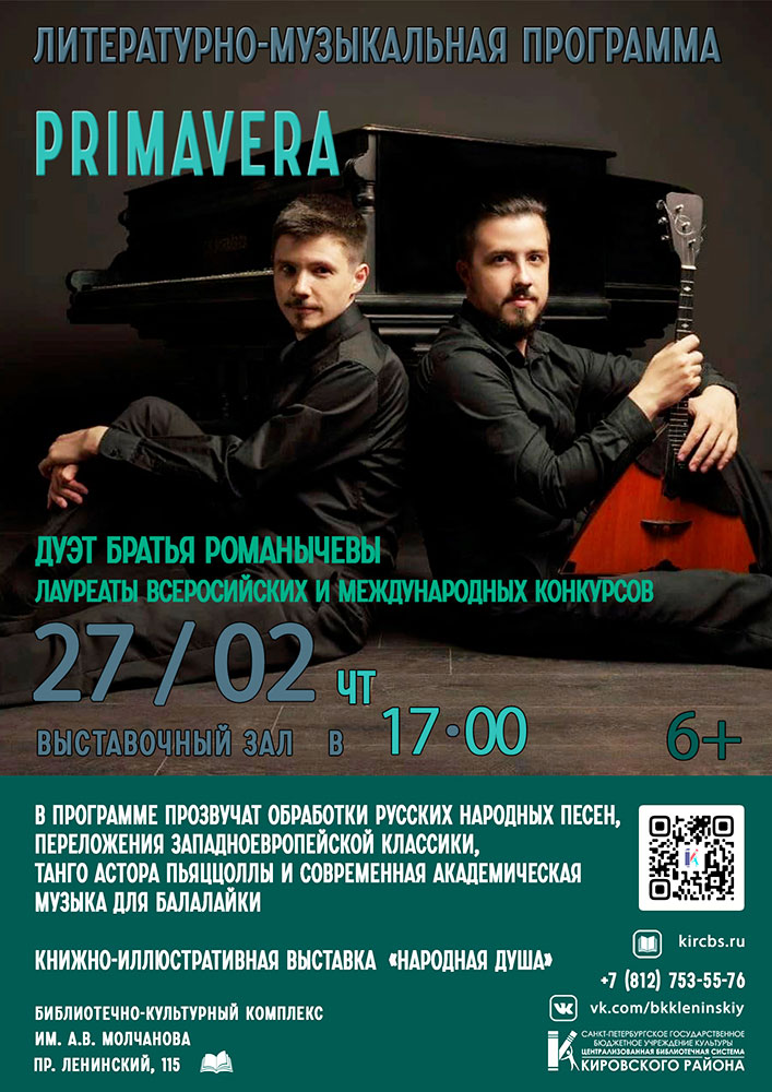 27 февраля в 17.00 в Выставочном зале Библиотечно-культурного комплекса им. А. В. Молчанова (Ленинский пр., д. 115) состоится Литературно-музыкальная программа "Primavera".