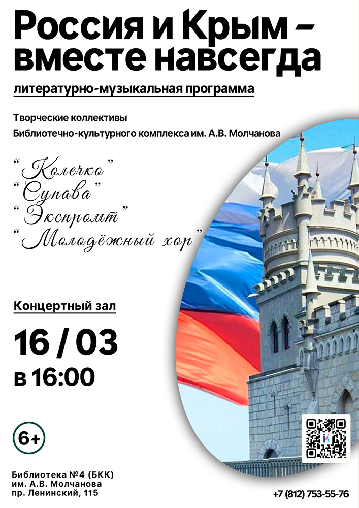 16 марта в 16.00 в Концертном зале Библиотеки №4 (Библиотечно-культурного комплекса) им. А. В. Молчанова (Ленинский пр., д. 115) состоится Литературно-музыкальная программа "Россия и Крым - вместе навсегда".
