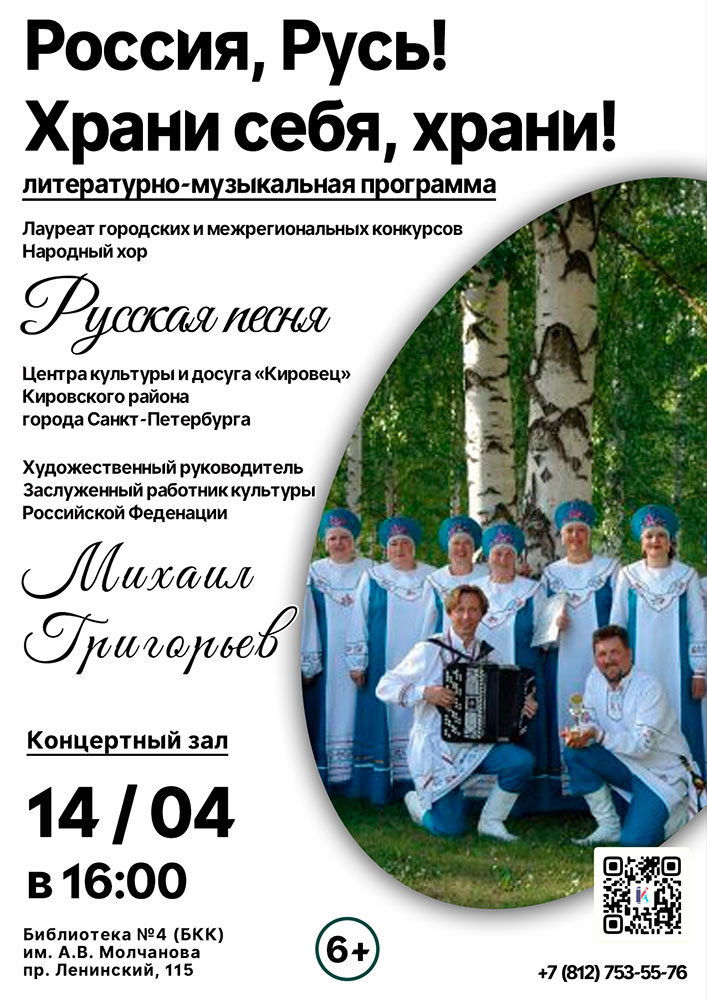 14 апреля в 16.00 в концертном зале Библиотеки №4 (Библиотечно-культурного комплекса) им. А. В. Молчанова (Ленинский пр., д. 115) состоится Литературно-музыкальная программа "Россия, Русь! Храни себя, храни!".