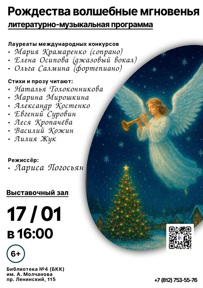 17 января в 16.00 в выставочном зале Библиотеки №4 (Библиотечно-культурного комплекса) им. А. Молчанова (Ленинский пр., д. 115) состоится Литературно-музыкальная программа "Рождества волшебные мгновенья".