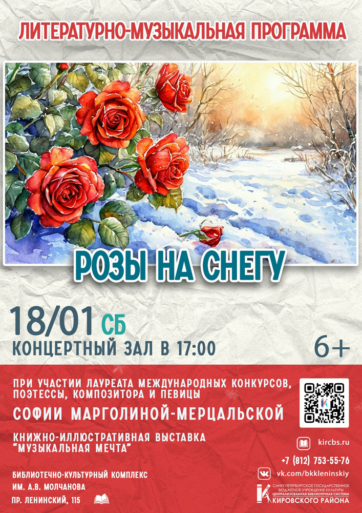 18 января в 17.00 в Концертном зале Библиотечно-культурного комплекса им. А. В. Молчанова (Ленинский пр., д. 115) состоится Литературно-музыкальная программа "Розы на снегу".