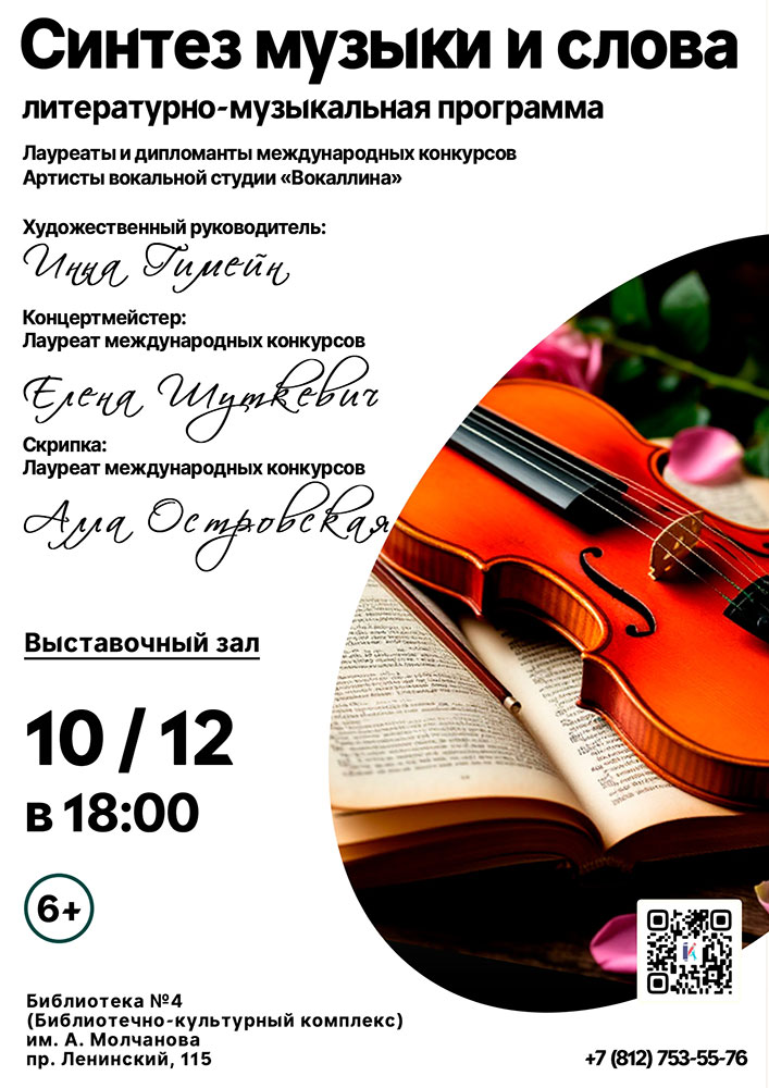 10 декабря в 18.00 в Выставочном зале Библиотеки №4 (Библиотечно-культурного комплекса) им. А. Молчанова (Ленинский пр., д. 115) состоится Литературно-музыкальная программа "Синтез музыки и слова".