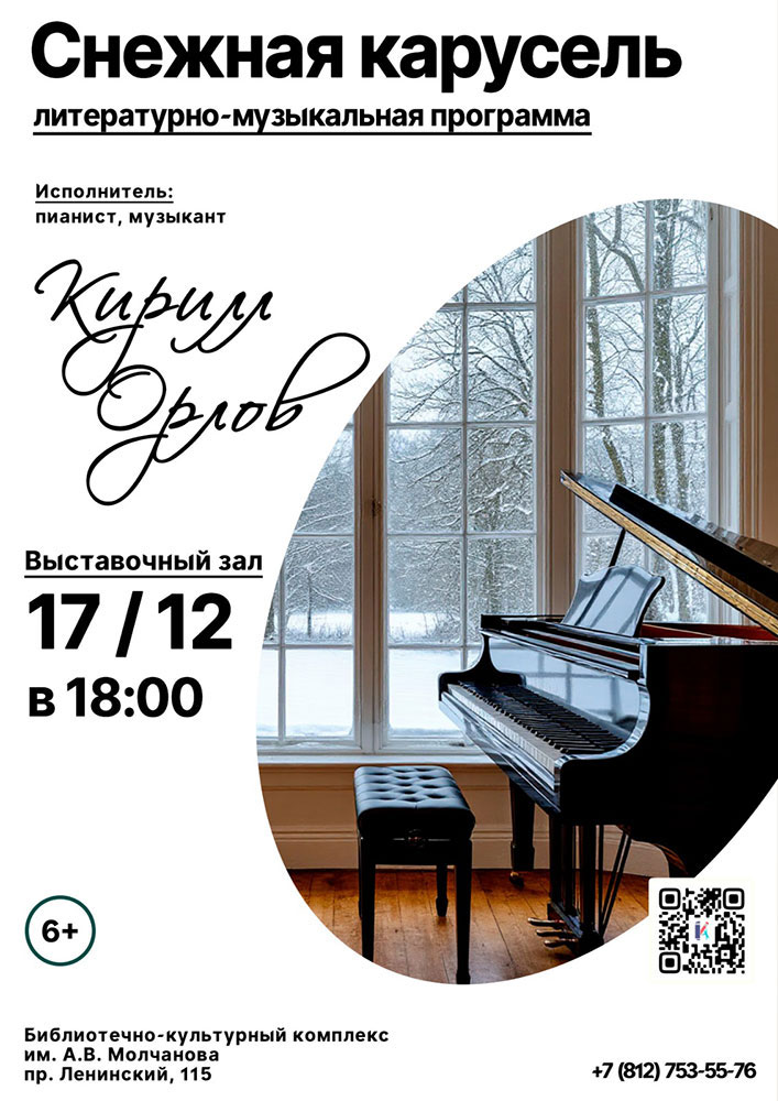 17 декабря в 18.00 в Выставочном зале Библиотеки №4 (Библиотечно-культурного комплекса) им. А. Молчанова (Ленинский пр., д. 115) состоится Литературно-музыкальная программа "Снежная карусель".