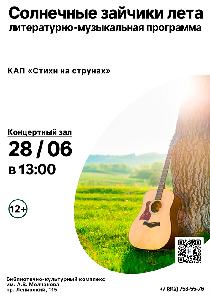 28 июня в 13.00 в Концертном зале Библиотечно-культурного комплекса им. А. В. Молчанова (Ленинский пр., д. 115) состоится Литературно-музыкальная программа "Солнечные зайчики лета".