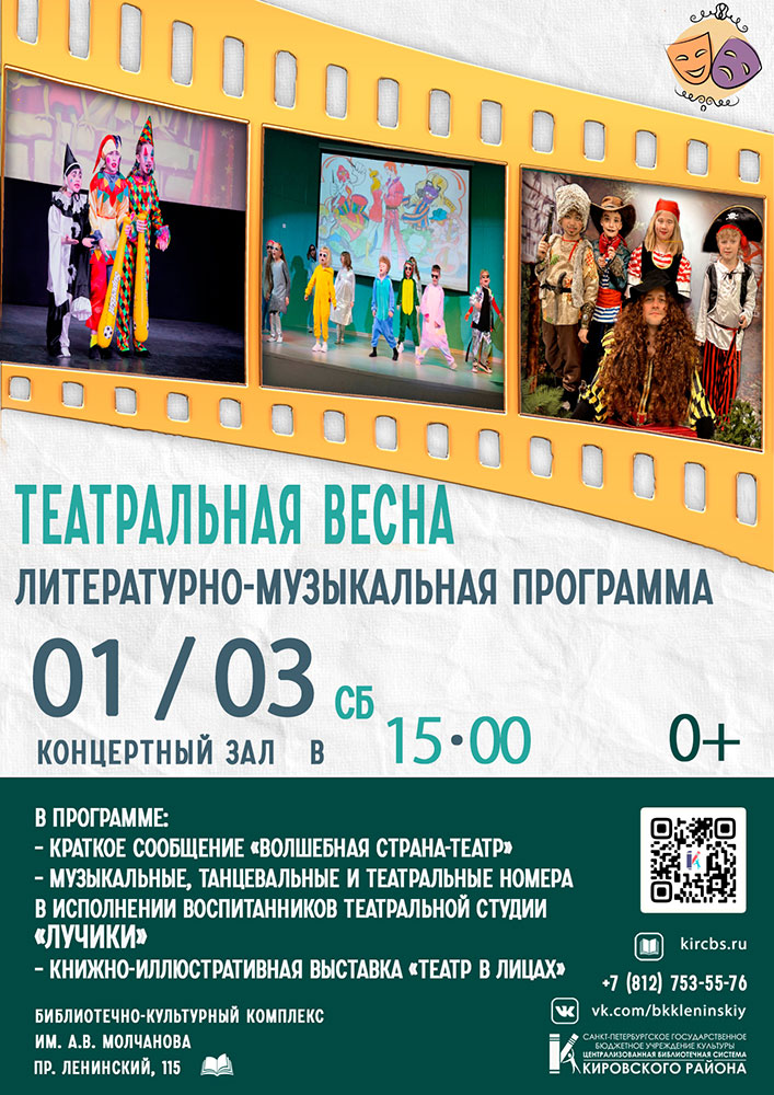 1 марта в 15.00 в Концертном зале Библиотечно-культурного комплекса им. А. В. Молчанова (Ленинский пр., д. 115) состоится Литературно-музыкальная программа "Театральная весна".