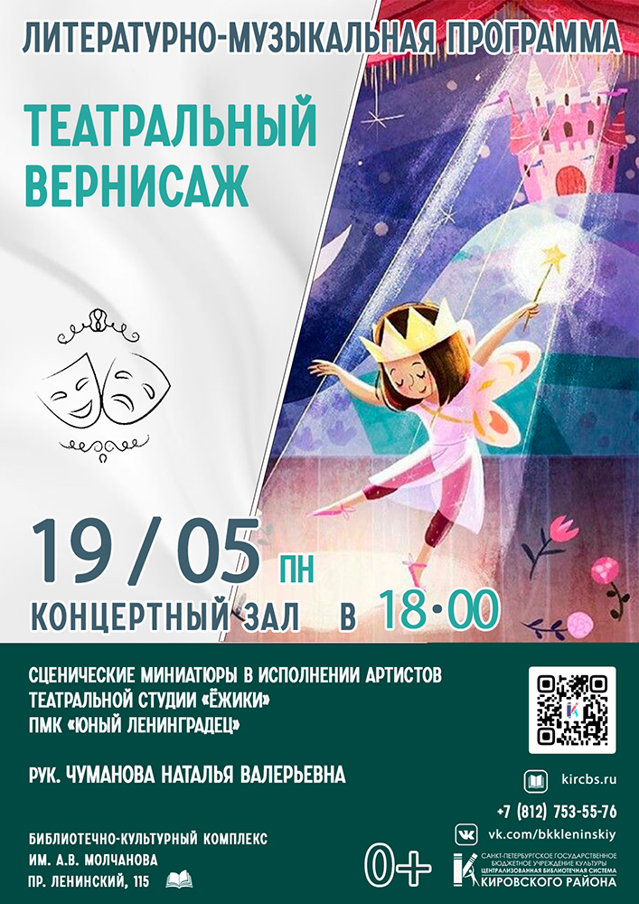 19 мая в 18.00 в Концертном зале Библиотечно-культурного комплекса им. А. В. Молчанова (Ленинский пр., д. 115) состоится Литературно-музыкальная программа "Театральный вернисаж".