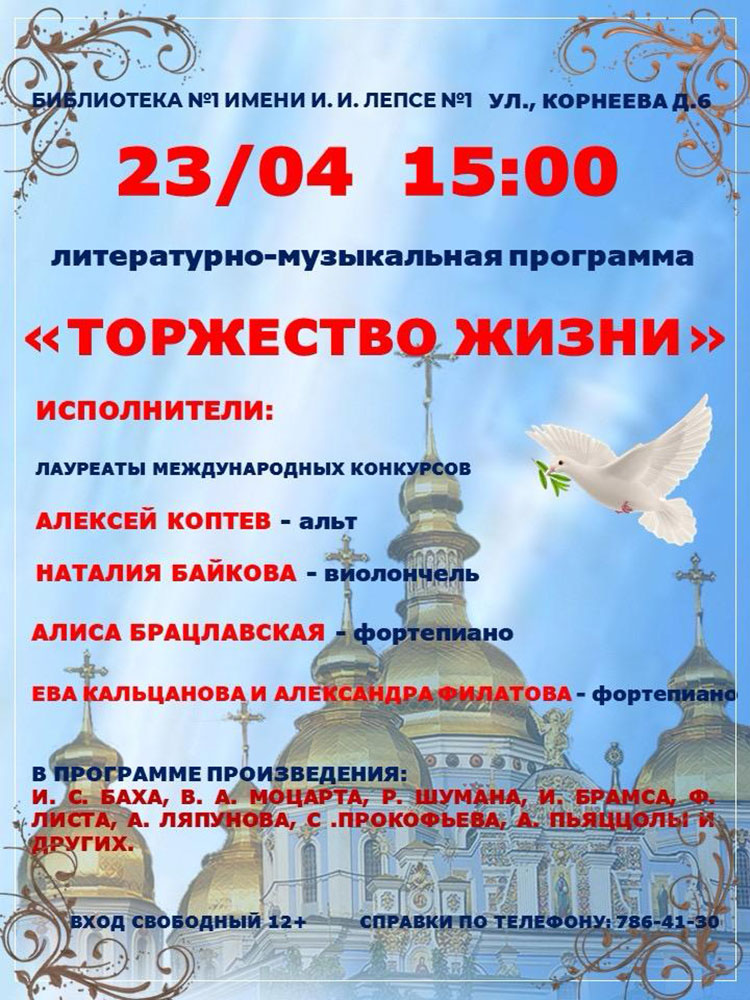 Библиотека №1 им. И. И. Лепсе приглашает на Литературно-музыкальную программу "Торжество жизни".