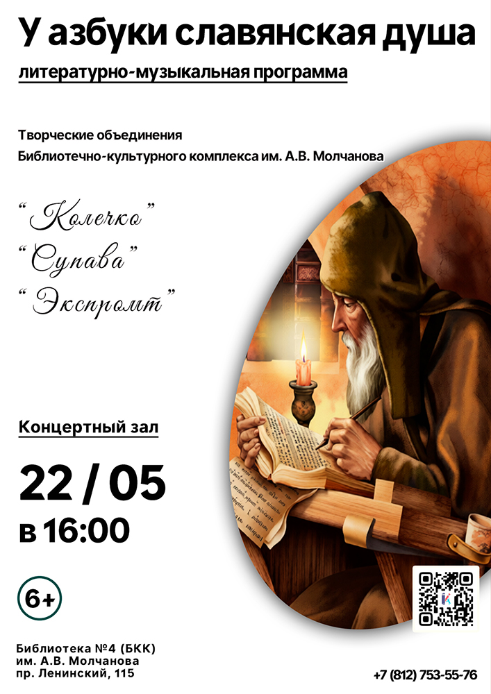 22 мая в 16.00 в концертном зале Библиотеки №4 (Библиотечно-культурного комплекса) им. А. В. Молчанова (Ленинский пр., д. 115) состоится Литературно-музыкальная программа "У азбуки славянская душа".