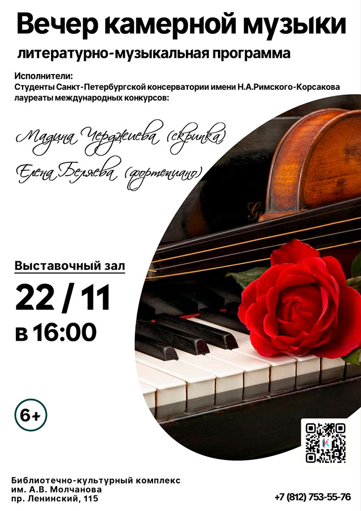 22 ноября в 16.00 в Выставочном зале Библиотечно-культурного комплекса им. А. В. Молчанова (Ленинский пр., д. 115) состоится Литературно-музыкальная программа "Вечер камерной музыки".