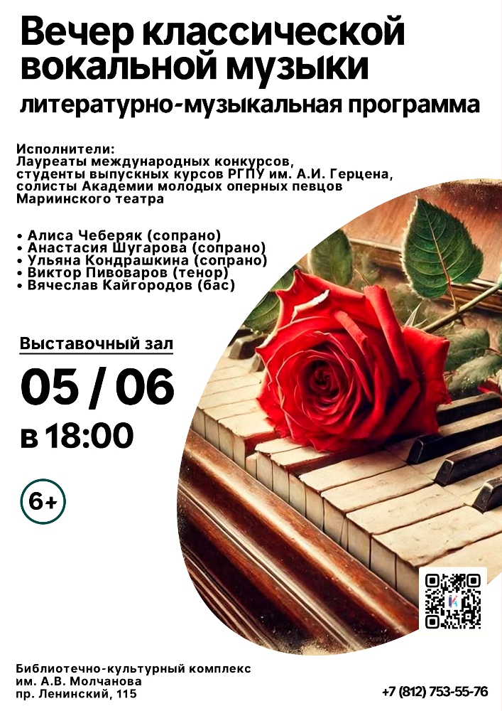 5 июня в 18.00 в Выставочном зале Библиотечно-культурного комплекса им. А. В. Молчанова (Ленинский пр., д. 115) состоится Литературно-музыкальная программа "Вечер классической вокальной музыки".