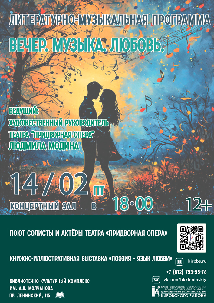 14 февраля в 18.00 в Концерном зале Библиотечно-культурного комплекса им. А. В. Молчанова (Ленинский пр., д. 115) пройдет Литературно-музыкальная программа "Вечер. Музыка. Любовь".