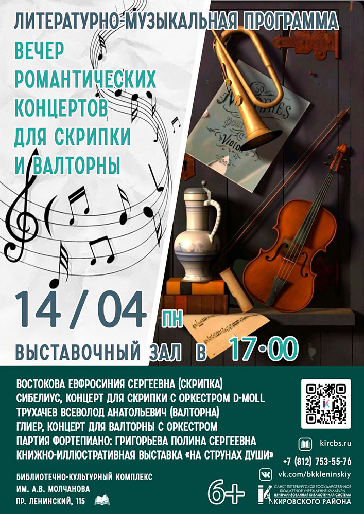 14 апреля в 17.00 в Выставочном зале Библиотечно-культурного комплекса им. А. В. Молчанова (Ленинский пр., д. 115) состоится Литературно-музыкальная программа "Вечер романтических концертов для скрипки и валторны".