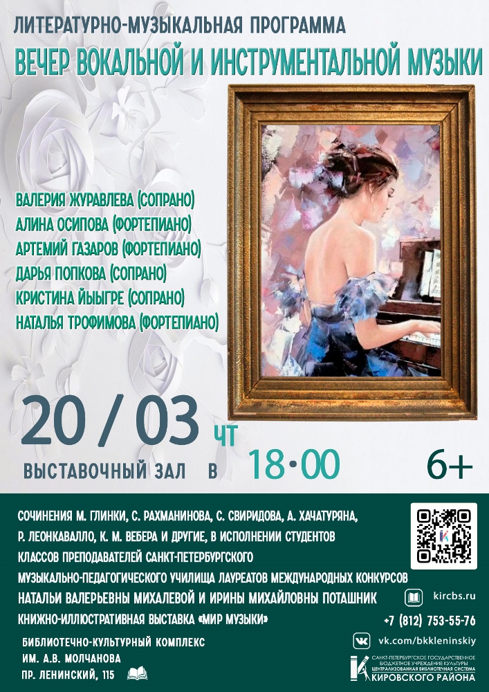 20 марта в 18.00 в Выставочном зале Библиотеки №4/ Библиотечно-культурного комплекса им. А.В. Молчанова (Ленинский пр., д. 115) состоится литературно-музыкальная программа "Вечер вокальной и инструментальной музыки".