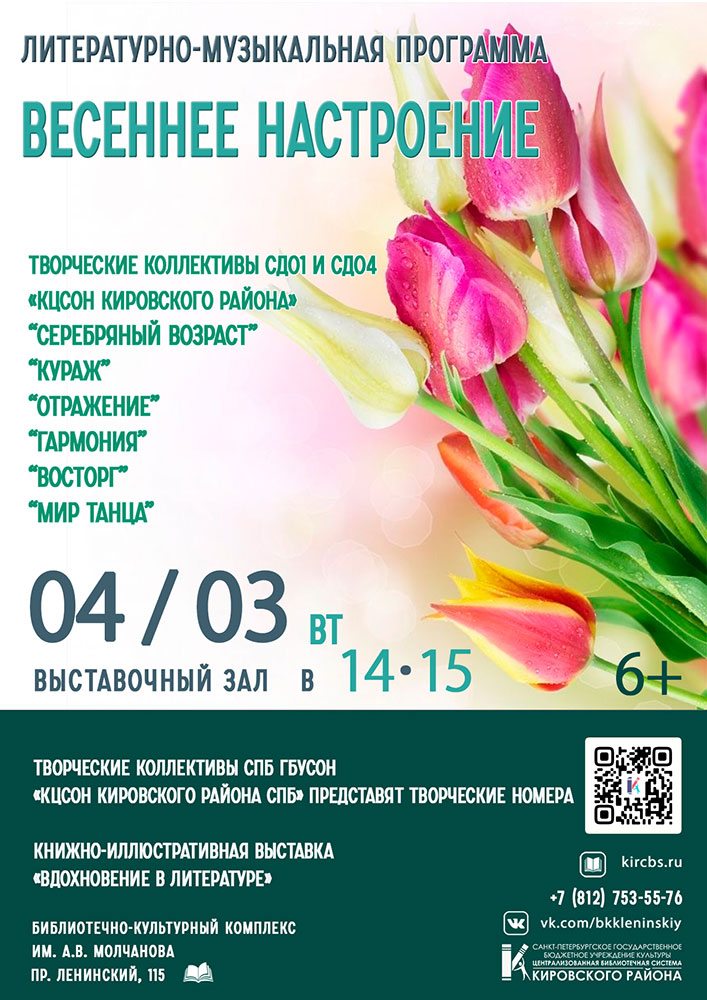 4 марта в 14.15 в Литературной гостиной Библиотечно-культурного комплекса им. А.В. Молчанова (Ленинский пр., д. 115) состоится Литературно-музыкальная программа "Весеннее настроение".