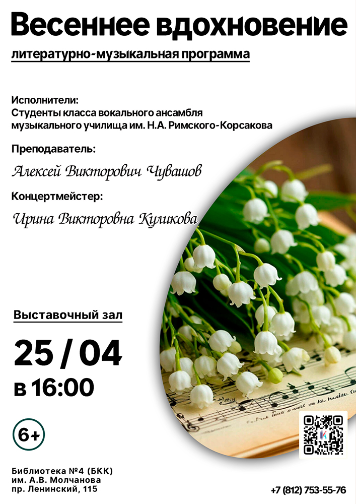 25 апреля в 16.00 в выставочном зале Библиотеки №4 (Библиотечно-культурного комплекса) им. А. В. Молчанова (Ленинский пр., д. 115) состоится Литературно-музыкальная программа "Весеннее вдохновение".