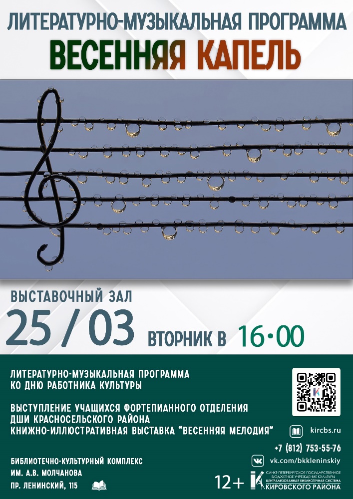 25 марта в 16.00 в Выставочном зале Библиотеки №4/ Библиотечно-культурного комплекса им. А.В. Молчанова (Ленинский пр., д. 115) состоится литературно-музыкальная программа "Весенняя капель".