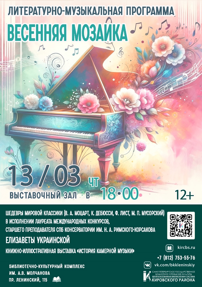 13 марта в 18.00 в Выставочном зале Библиотеки №4/ Библиотечно-культурного комплекса им. А.В. Молчанова (Ленинский пр., д. 115) состоится литературно-музыкальная программа "Весенняя мозаика".