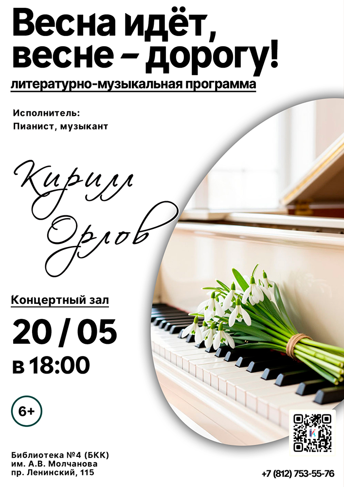 Пианист, музыкант Кирилл Орлов исполнит музыкальные произведения, посвящённые весне, создавая атмосферу лёгкости и вдохновения.